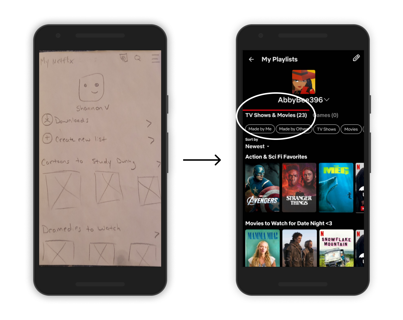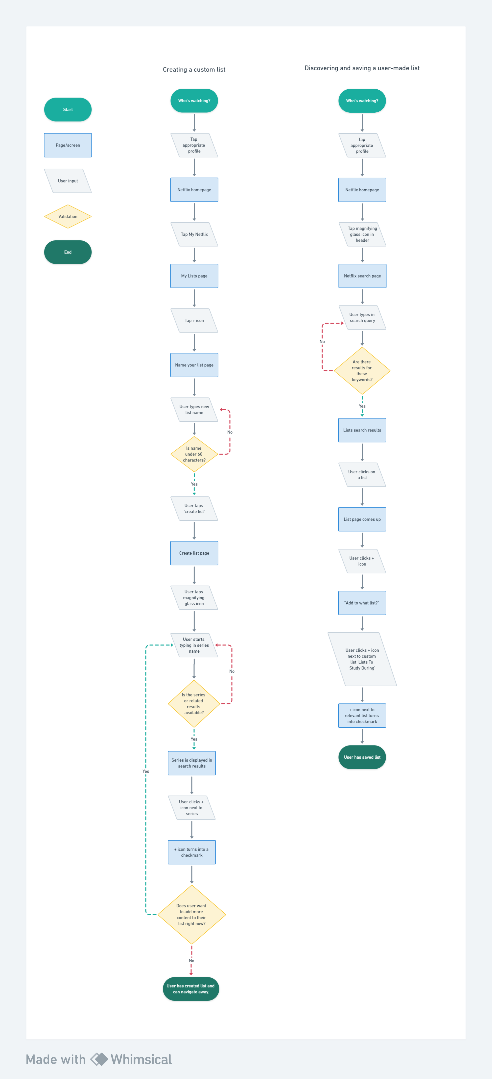 Whether it was occasional or daily, users were getting and giving suggestions from friends through Facebook, text message, and in-person. I took inspiration from Spotify, an app that also has thousands of content options for its users, that allows users to create and share customized playlists that suit every mood and situation. This would help cut down on the overwhelming number of options on Netflix and ensure a close friend or family member has already vouched for these shows/movies.