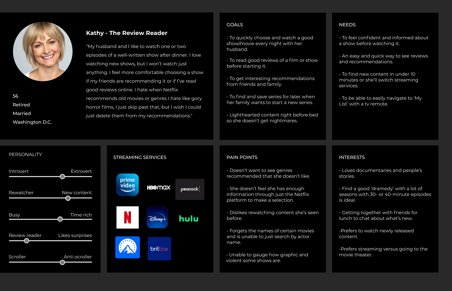 I interviewed 7 people about their streaming habits and opinions on finding content. These users were between 25-65 years old with 3 being full-time workers, 2 students, and 2 retirees. These users were chosen because they used Netflix almost everyday and had “very strong” opinions on scrolling and finding new content.