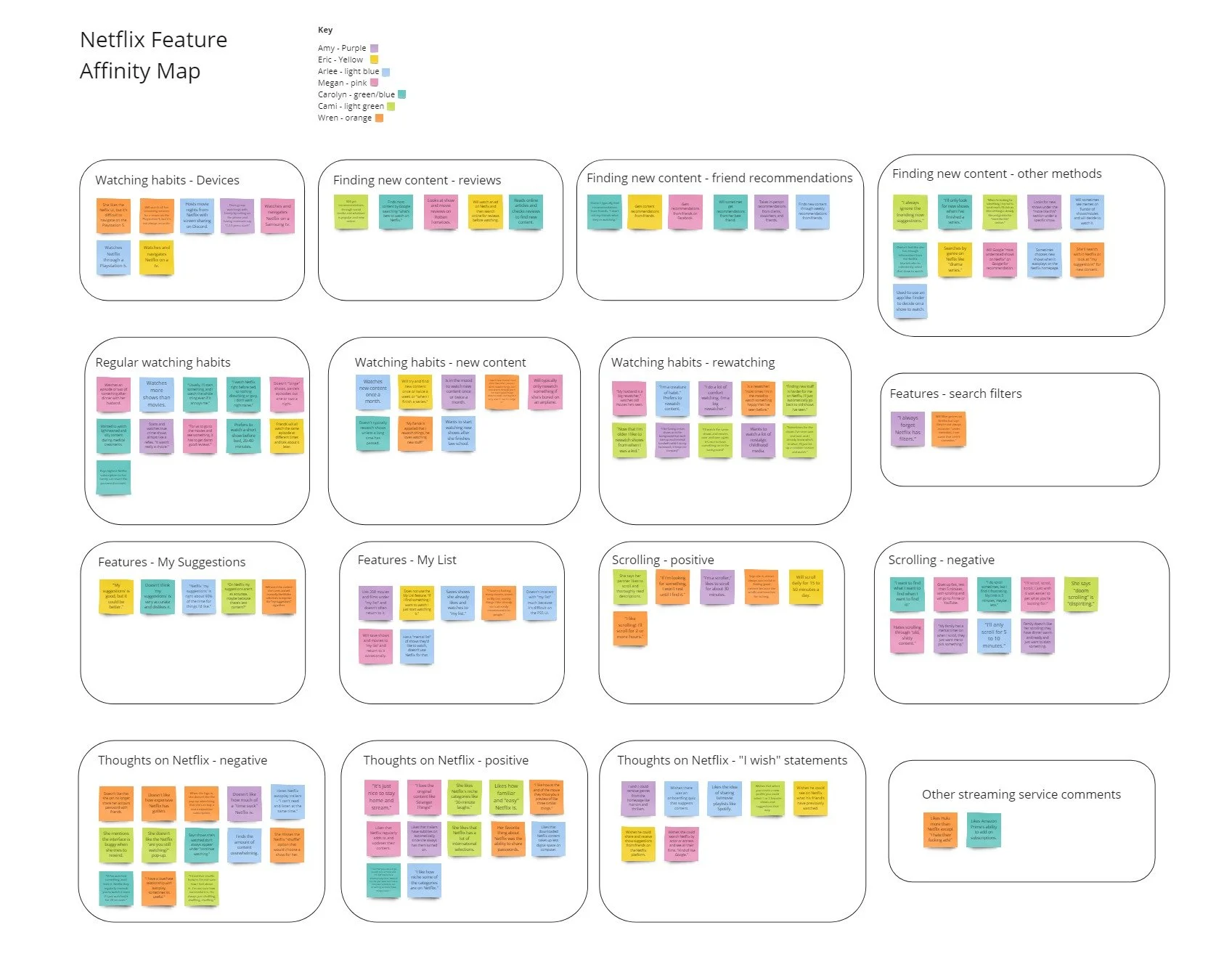 My assumption that “everyone hates scrolling,” was quickly shattered during these interviews. Many people do dislike it, but there was also a vocal group that enjoyed meticulously going through their options. Some of the main categories for the affinity map addressed how people find content, whether they tend to rewatch old content or seek out new shows, scrolling preferences, and general feelings on Netflix and other streaming services.