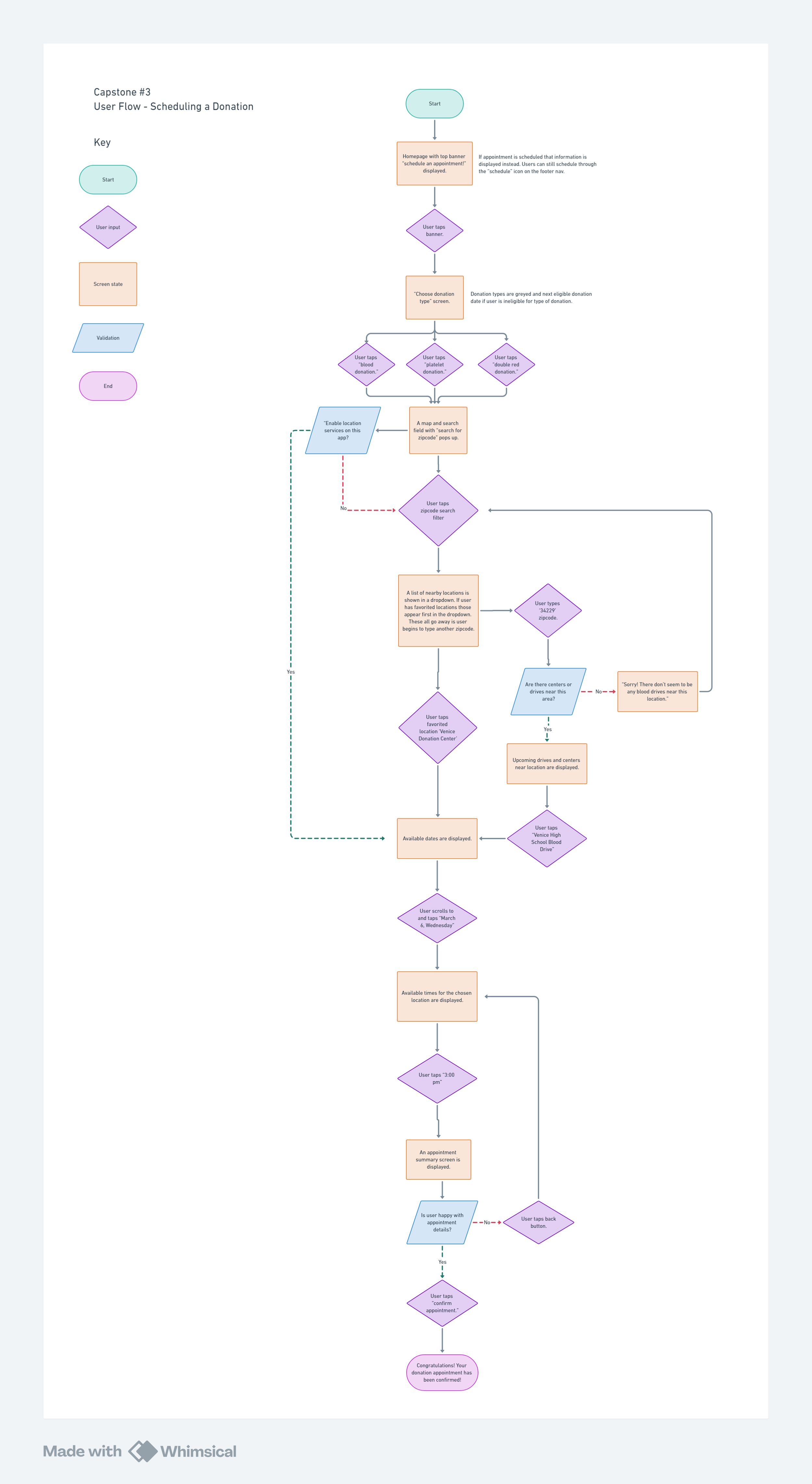 The site map features 4 main sections: home, donations, scheduling, and rewards. The homepage was designed to act as a hub for users to explore additional material. The virtual donor card and next appointment are at the top while patient stories and articles are further down for users who have more time and want to scroll.