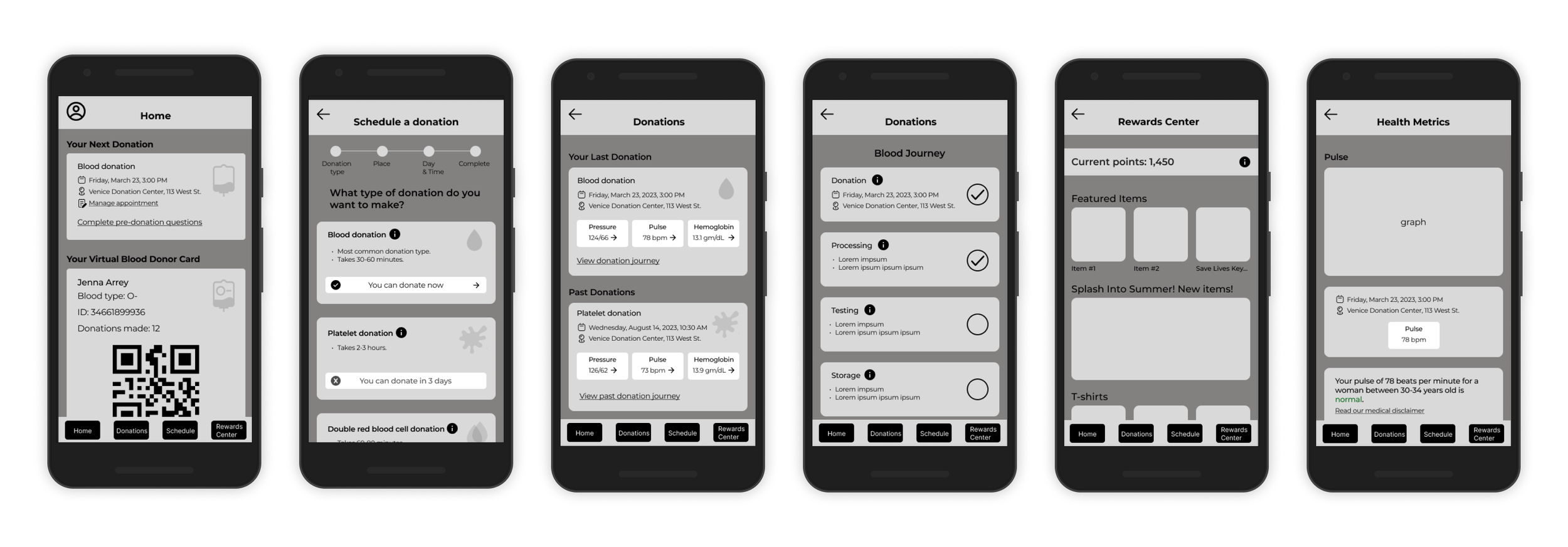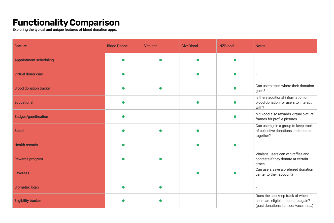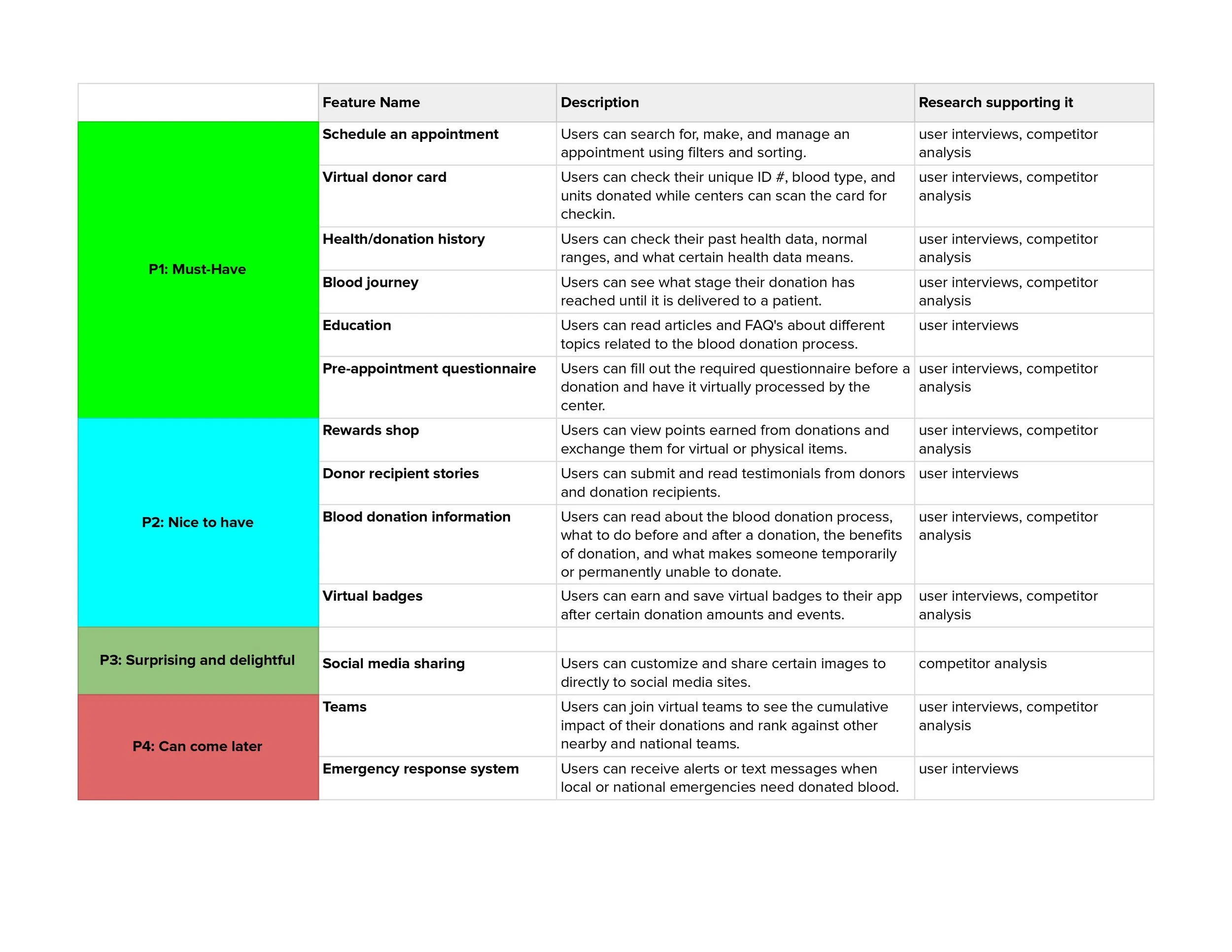 Analyzing the features of each app was essential in parsing out which ones were industry standard, such as the scheduling tool. I also wanted to see features that seem popular but aren’t ubiquitous, like the virtual donor card and “blood journey” which shows donors when their donations have been processed and given to patients.