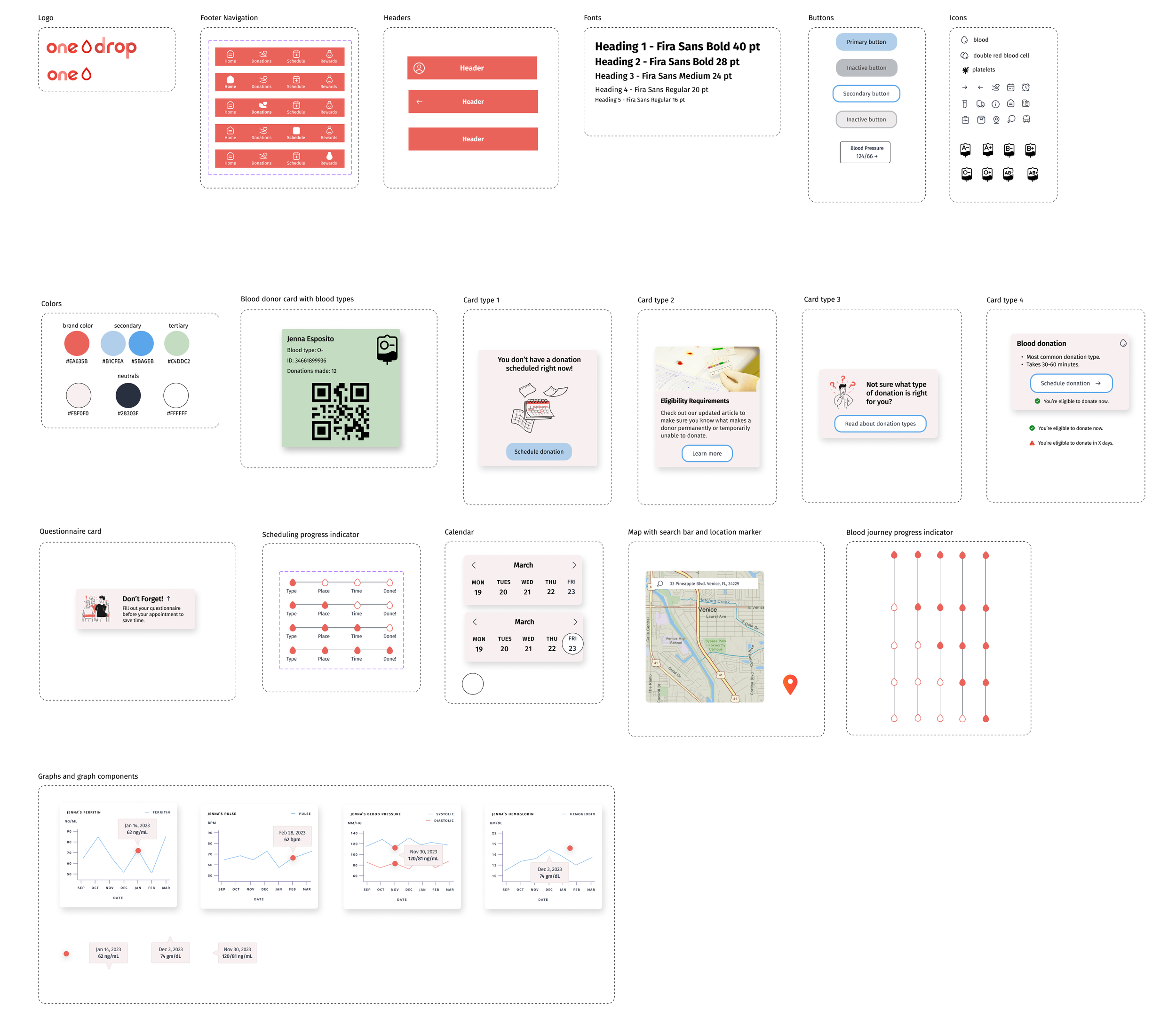 Crafting the brand identity for this project was a fun challenge. Most blood donation apps use a monochromatic red color scheme, due to the obvious subject matter, so I used a dark red for the brand color. Cool greens and blues are also used to create a calming effect for potentially squeamish users.