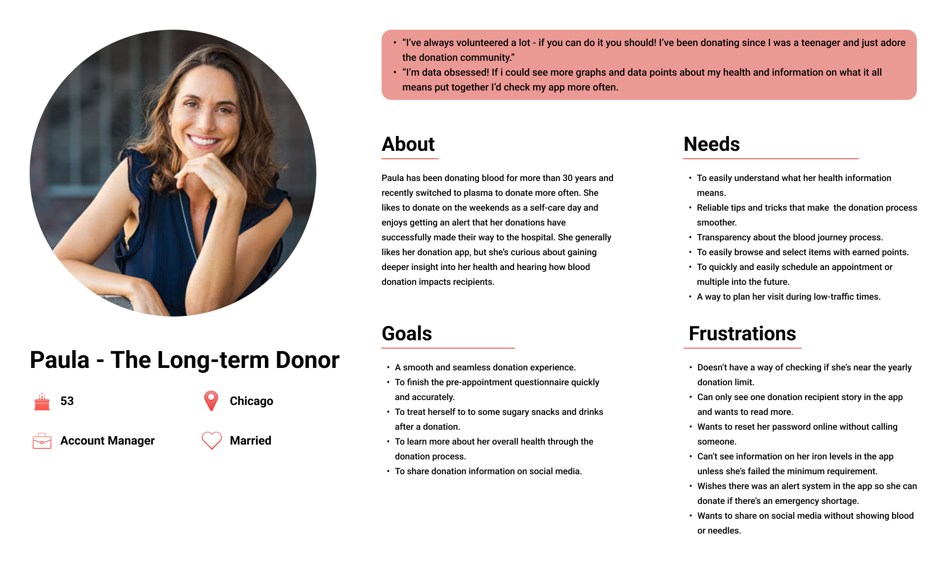 Thes users have similar goals of wanting to easily book appointments, but their experience with blood donation and their apps are just a bit different. Kai also cares a bit more about getting swag compared to Paula!