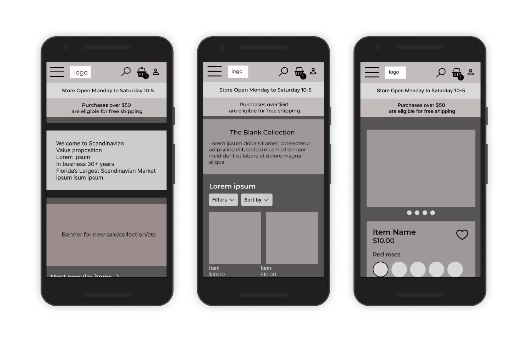 Icons selected were simple, but had a unique flair. Instead of a shopping cart there’s a basket and the heart/add to wishlist icon with delicate, twirling lines was inspired by traditional Scandinavian wooden folkart.