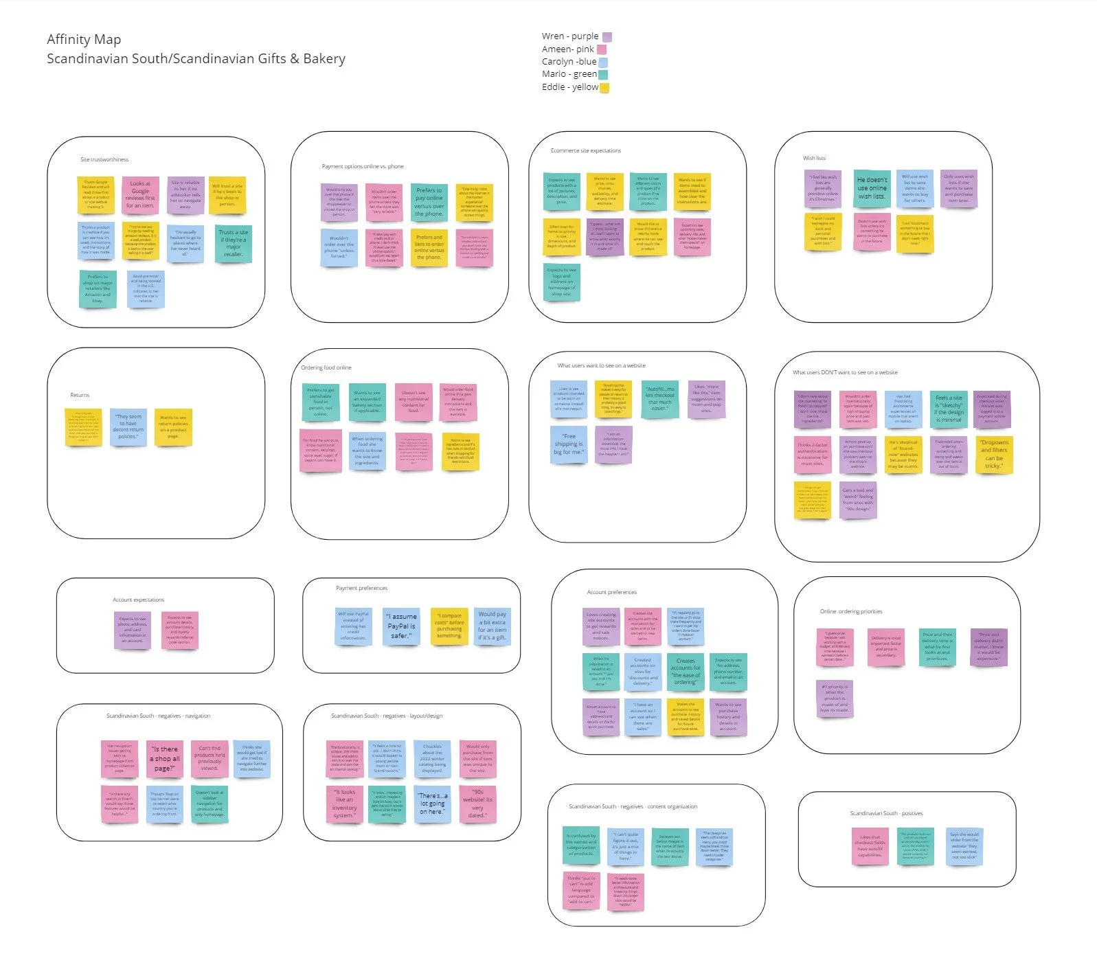 An affinity map was helpful in determining what users care about the most when shopping online and drove the high-priority changes on the current site. Some major categories include: